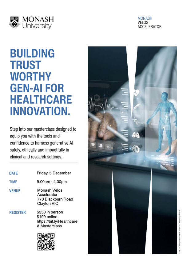 You’re invited to join the upcoming Monash Velos Accelerator x Monash AI Institute Masterclass – Building Trustworthy GenAI for Healthcare Innovation, an inspiring one-day experience designed to equip healthcare and research professionals with the vision, tools and confidence to harness AI safely, ethically and impactfully in clinical and research settings.